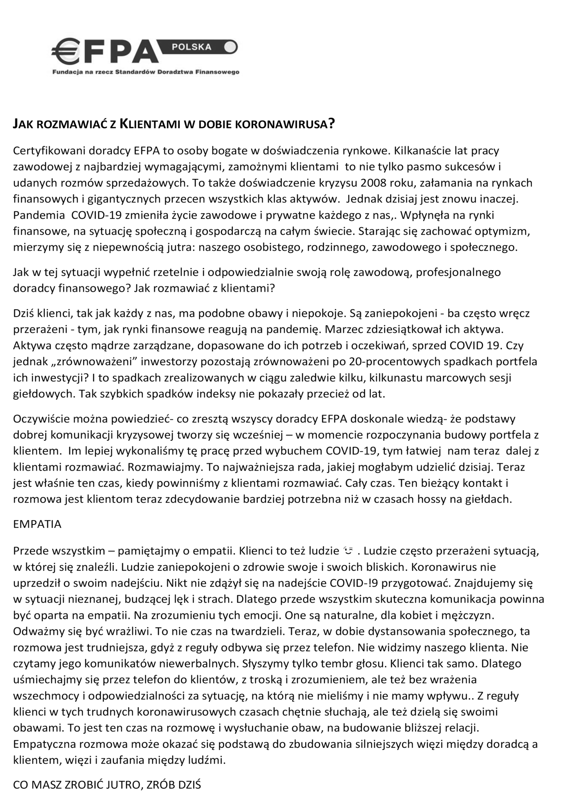 - Zbudowaliśmy i rozwijamy Społeczność Certyfikowanych Doradców EFPA w Polsce.